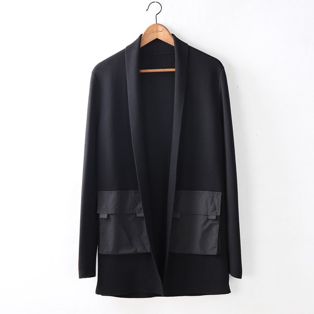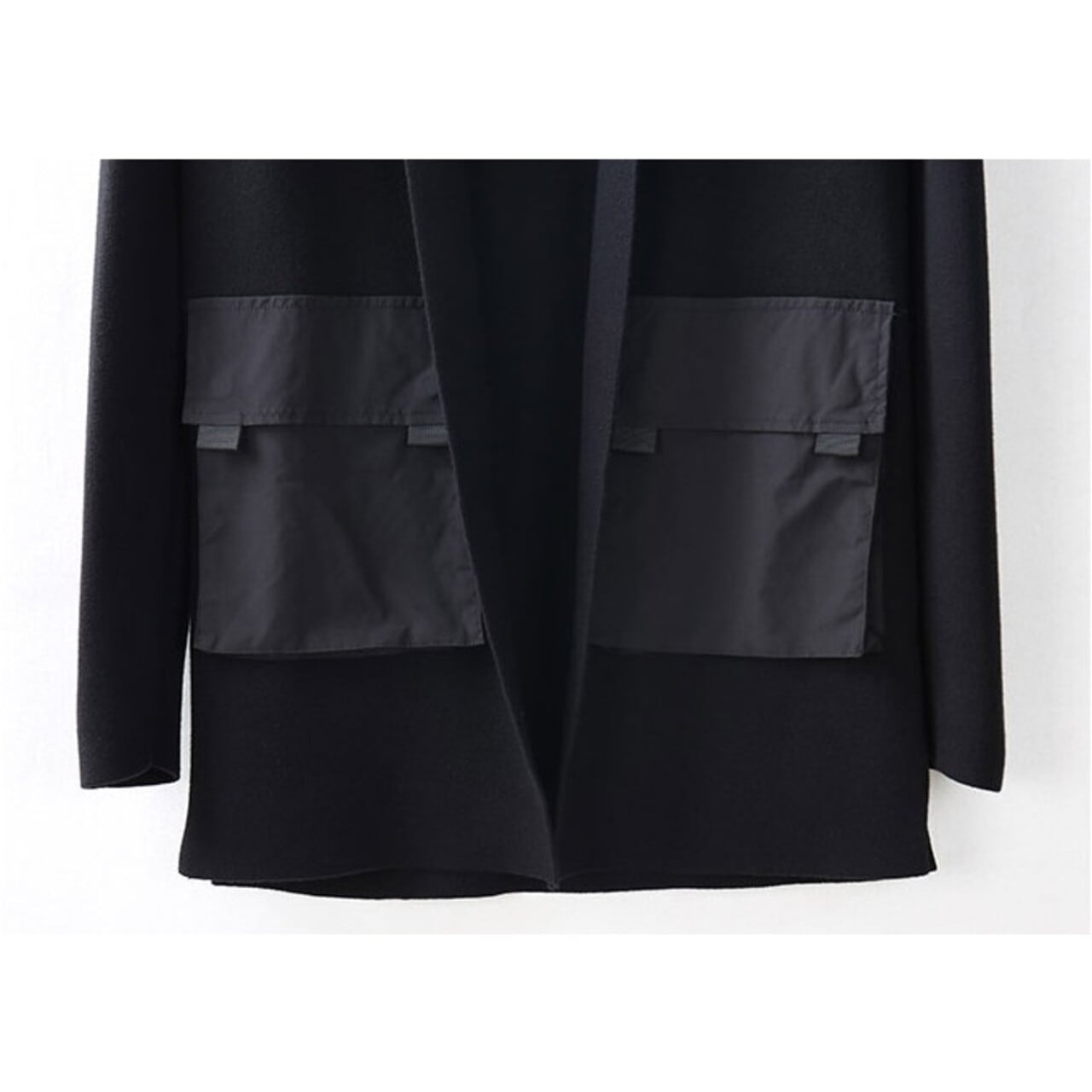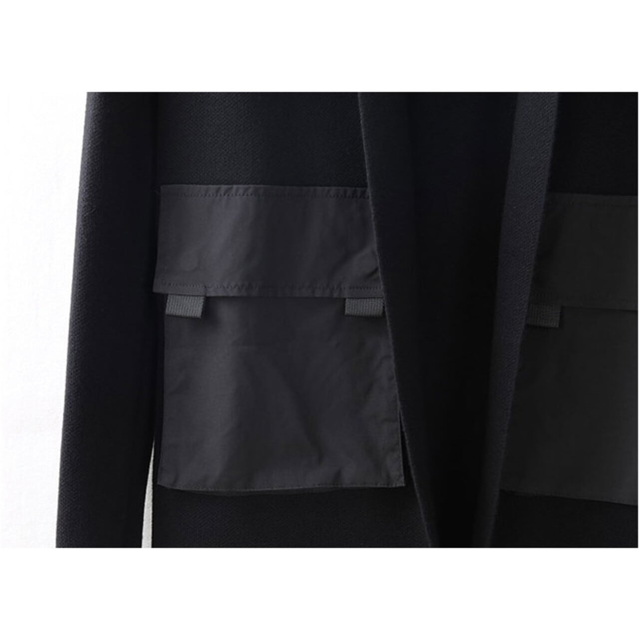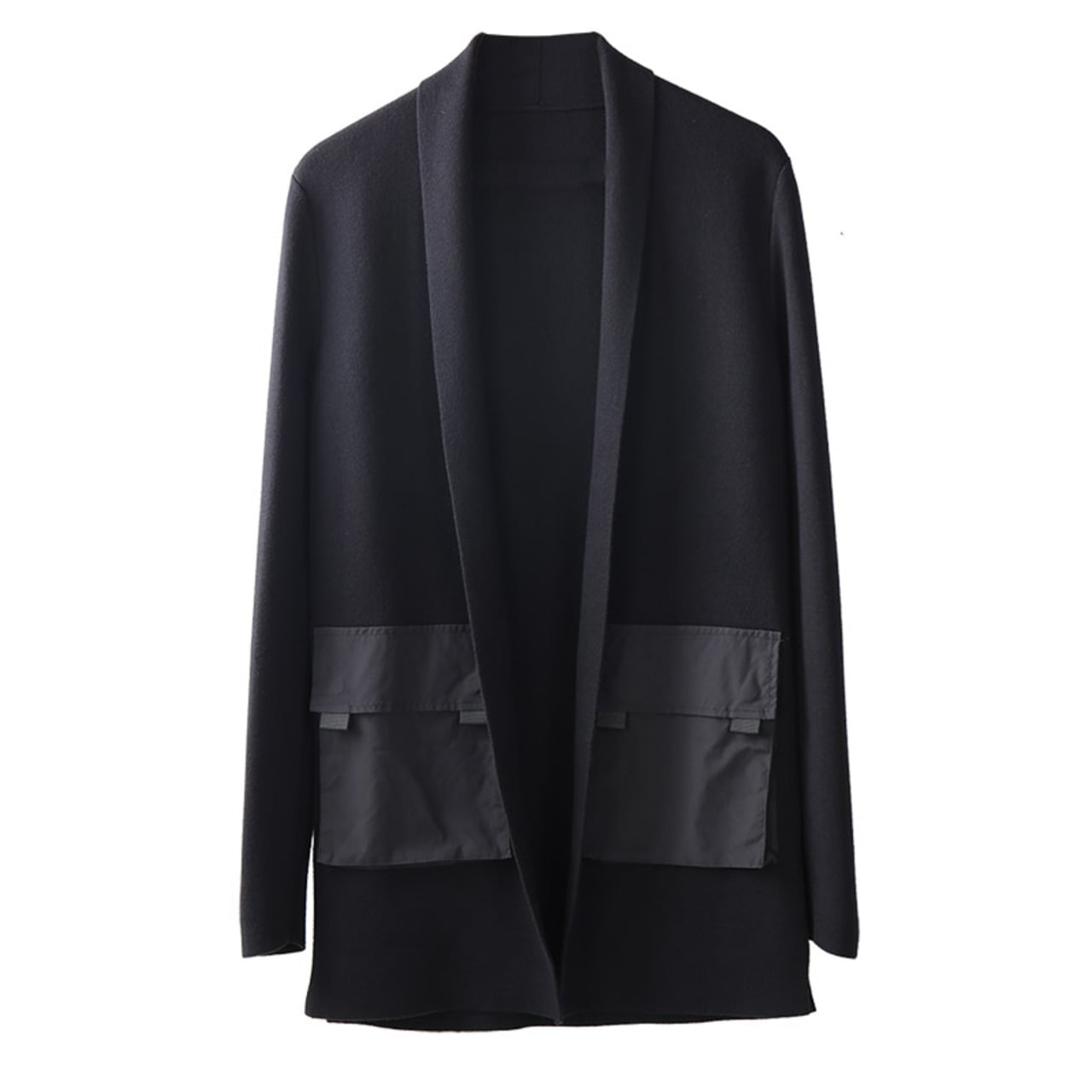 その最大の魅力は、ニットの柔らかな質感に対し、腰元に配置されたシャープな異素材フラップポケットがもたらすコントラストです。