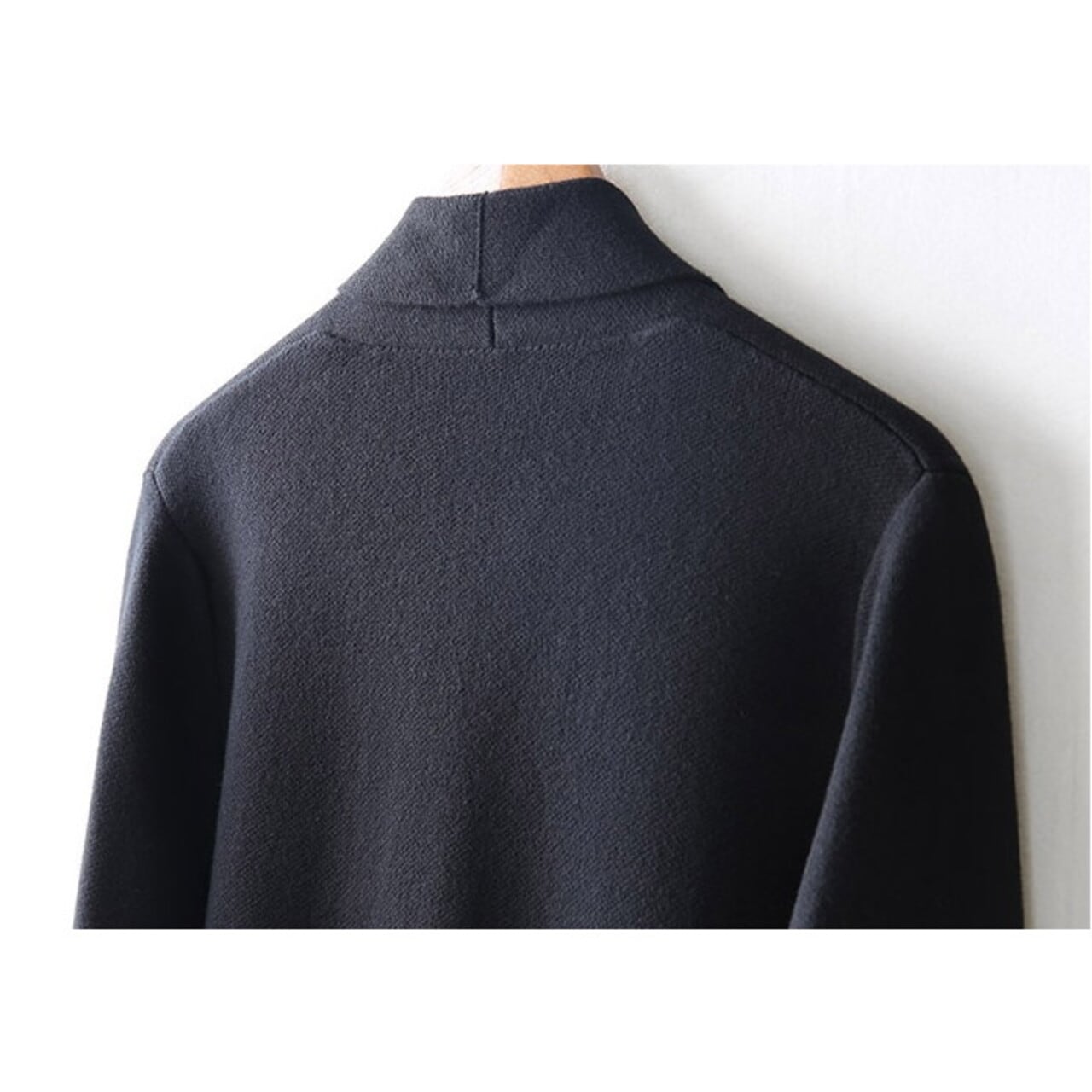 堅苦しいスーツを脱ぎ捨てた身体に、滑らかで上質なブラックニットがドレープを描きます。