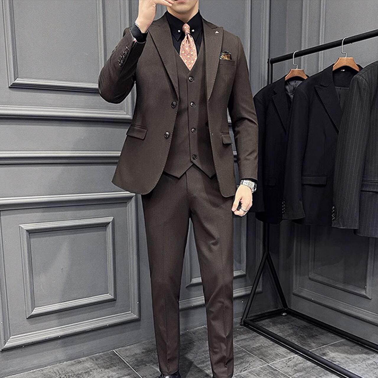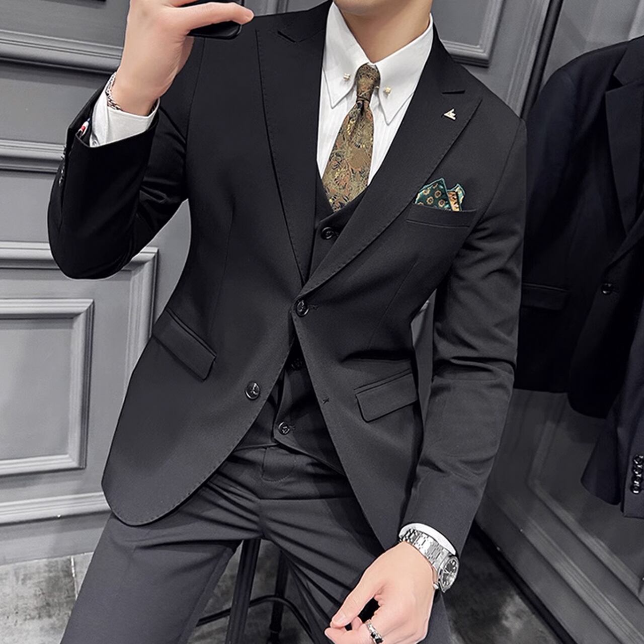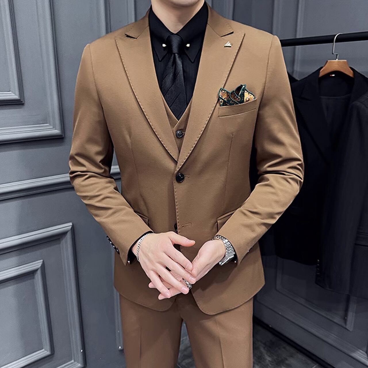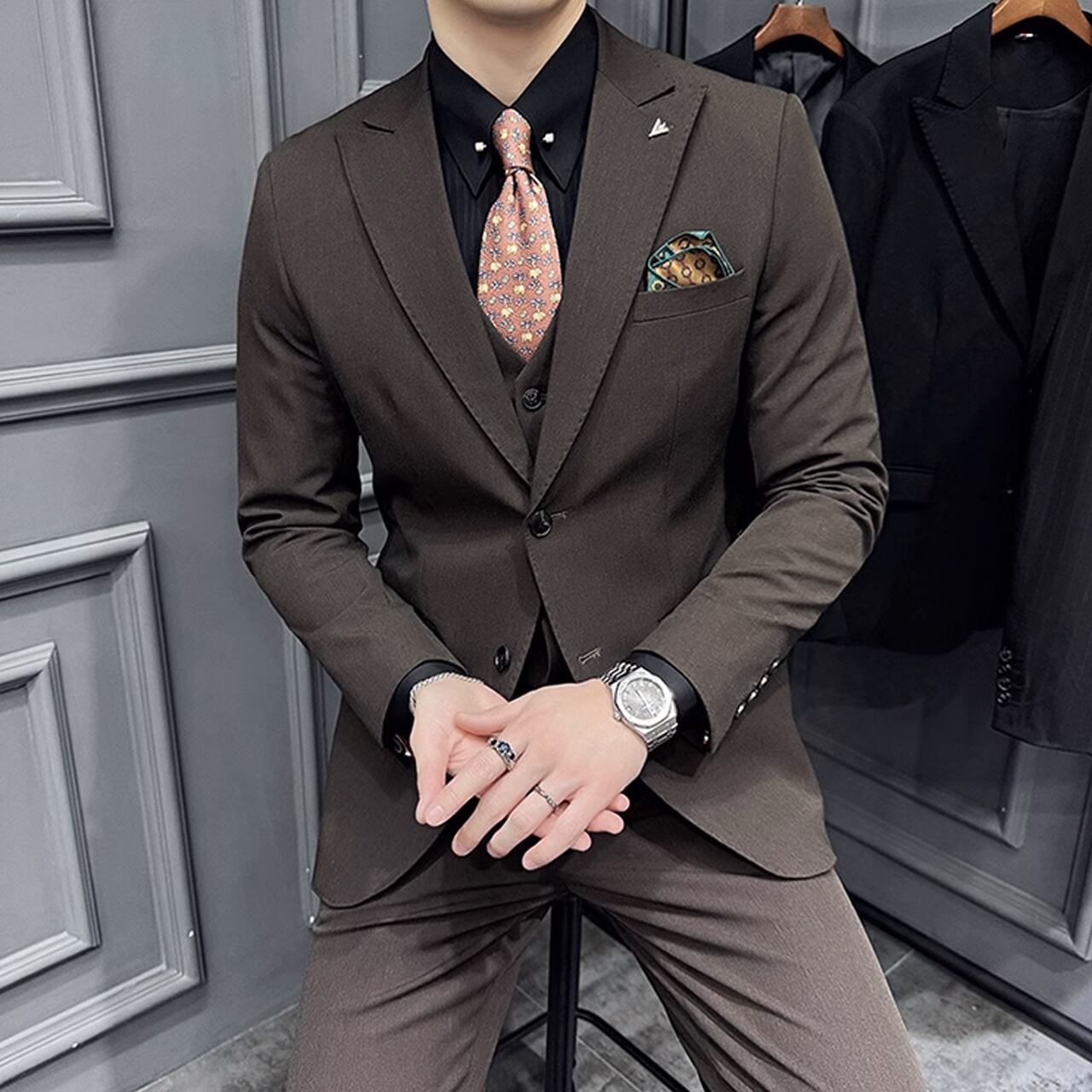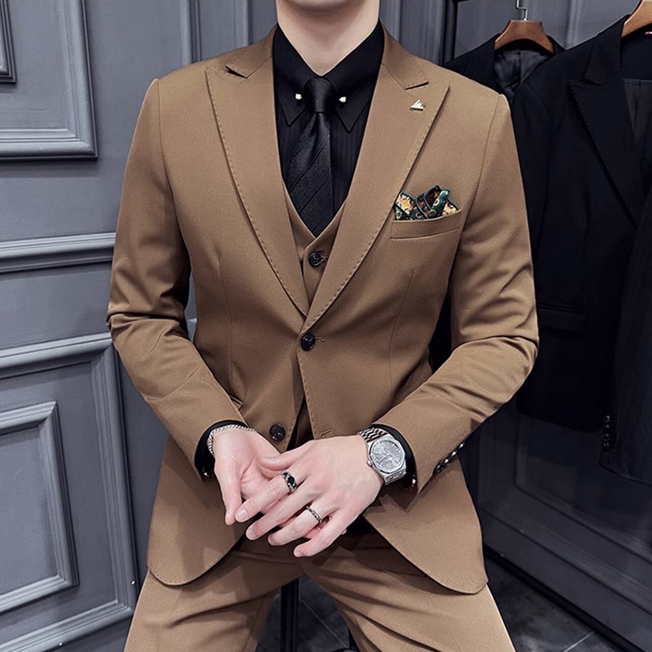ジャケット、ベスト、パンツの3ピースセットで、ビジネスシーンからフォーマルなパーティーまで幅広い場面で活躍します。